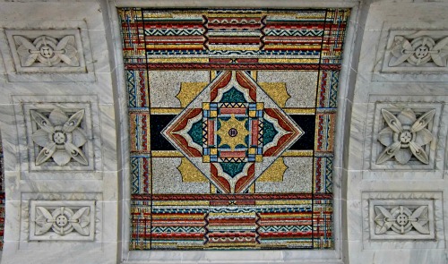 The ceiling of the loggia contains geometric mosaics. Some of the carvings near the main entrance are highly stylized and would fit into any Art Deco gallery.