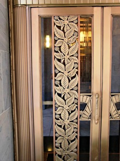 Conversely the grills on the entry doors have a repeating Buckeye leaf pattern that is not strongly Art Deco. If you had designed the leaves absent of any desire to create an Art Deco building the pattern would not look all that different. The leaves are little flatter, a little more two-dimensional, but if I had come across these in another context I would not have said “Art Deco”. The one part of the grill that is strongly Art Deco is the geometric pattern on the part of the grill that connects to the door fram near the handle. |