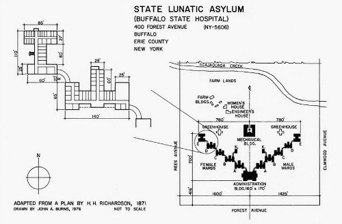 Asylums of that time were built on the Kirkbride plan, which was designed to provide good views for every room. An administration building would have two sets of cascading wings set back from the building. The plan for Richardson's complex is shown below. It is the central building plus five buildings on either wing, with each building connected with a curved corridor. Males were on one wing and females on another.